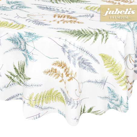 Mit filigranem Farn besticht die beschichtete Baumwolltischdecke Else blau. Wie einem Herbarium entnommen, präsentieren sich auf dem weißen Grund große, zarte Sträucher von Farn. Die Farbgebung des Farns auf dieser Decke ist sowohl ihrer natürlichen Farbe im Sommer angepasst, einem dunklen und einem helleren Grün, aber auch in herbstlichem Orange sind einzelne Zweige dabei. Weiterhin mischen sich Farnsträucher in zartem Violett und Türkis dazwischen. Das Farnkraut ist auf der Tischdecke mit großem Abstand zueinander angeordnet, so dass die weißen Flächen dazwischen die Wirkung des Herbariums hier noch einmal verstärken. Als Pflanzenfreund können Sie mit dieser Decke Else blau Ihre Gäste erfreuen, und hierauf nicht nur Kaffee und Kuchen am Nachmittag servieren, sondern durchaus auch bunte Salate zum Grillabend auf der Terrasse.
