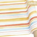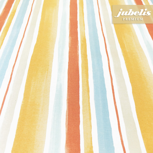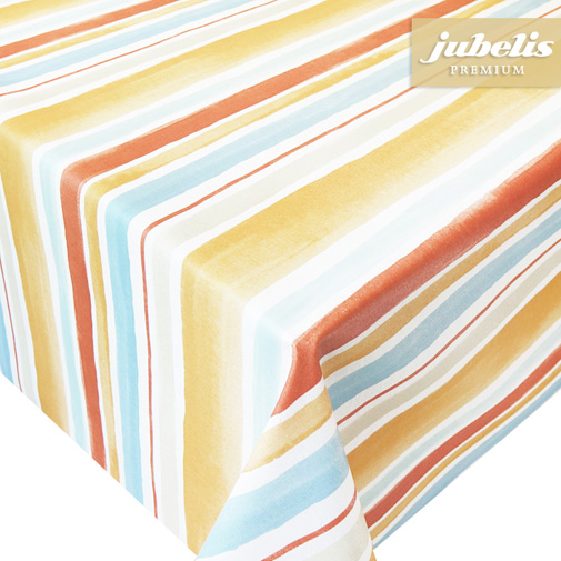 Die äußerst praktischen Tischdecken von Jubelis erhalten Sie in beliebigen Längen von der Rolle, die eine feste Breite von 140 Zentimeter aufweist. Es handelt sich um einen relativ weichen Baumwolluntergrund, der mit einer stabilen, abwaschbaren Folie überprägt ist. Das Motiv der Variante Aquilino terra darf als einfach und zeitlos bezeichnet werden. Es handelt sich um parallele gelbe, blaue, weiße, orange- und beigefarbene Streifen unterschiedlicher Breiten, die an ihren Rändern nicht exakt geradlinig, sondern bewusst etwas ausfasernd gestaltet sind. Mit diesem farblich breit gefächerten Outfit passt die Tischdecke in fast jede Küche, unabhängig von deren Stil und Farbwahl. Aber auch der Wohnzimmertisch lässt sich gut damit eindecken. Und die Tische im Außenbereich des kleinen eleganten Restaurants erfahren sogleich eine ganz und gar gemütliche Note, was natürlich auch für Ihren eigenen Garten gilt.
