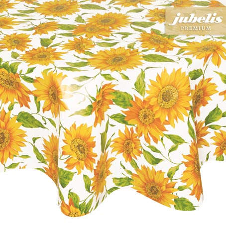 Dieses sommerliche Tischwäsche bringt mit großflächigen Sonnenblumen sofort den Sommer in Ihren Garten oder Ihre Küche. Das hochwertige Material besteht aus beschichteter Baumwolle und verspricht Ihnen eine lange Lebensdauer, ganz gleich ob Sie das Tischtuch draußen oder drinnen einsetzen. Sorgen Sie bei Ihrer nächsten Gartenparty für gute Stimmung oder gestalten Sie damit eine unvergessliche Kinderparty, denn dieses Motiv kommt sowohl bei jungen als auch bei älteren Menschen gut an. Sonnenblumen erfreuen das Gemüt und erzeugen eine lockere, unverkrampfte, aber trotzdem zeitlose Atmosphäre. Sie sind ein Symbol der reinen Lebensfreude und strahlen auch an weniger sonnigen Tagen Wärme aus. Die glatte Oberfläche erweist sich als sehr pflegeleicht, ganz gleich, ob ein Glas Saft umgeschüttet wurde oder weitere Flecken entfernt werden müssen. Selbstverständlich können Sie die fröhliche Tischdecke auch zur gewerblichen Nutzung bei großen Veranstaltungen nutzen. Mit diesem Klassiker treffen Sie garantiert den Geschmack Ihrer Gäste.