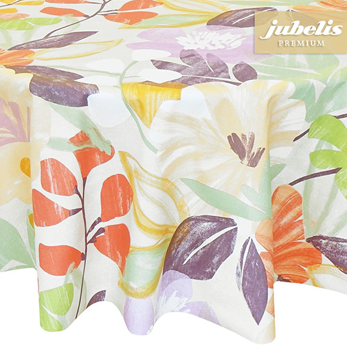 Dieses Tischdecke besitzt ein außerordentliches Blumenmuster. Die floralen Abbildung sind als sehr groß zu bezeichnen und nehmen viel Platz auf der Tischdeckenfläche ein. Dabei sind die vielen unterschiedlichen verwendeten Farbtöne zueinander passend und als dezent zu bezeichnen. Kurzum, es ergibt sich hier ein sehr ansprechendes Gesamtbild, welches auch gestalterisch eingesetzt werden kann. Die abwaschbare Tischdecke mit dem Namen Viola ist hier im Onlineshop auch noch in einer dunkleren Farbkombination auswählbar. Dank ihrer beschichteten Oberfläche ist diese Tischwäsche aus Baumwolle sowohl im Innenbereich wie auch im geschützten Außenbereich gut einsetzbar. In der Größenauswahl können Sie Ihre gewünschte Größe und Form einfach auswählen. Benötigen Sie von dieser Meterware eine größere Stückzahl, so empfiehlt sich hier der Kauf einer ganzen Rolle.