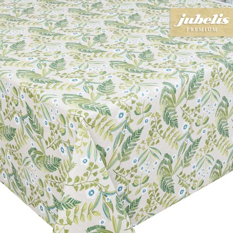 Auf einem naturfarbenen, beigen Hintergrund findet sich ein Blätterwerk von zarten Grüntönen. Die Zweige schmiegen sich ineinander. Weiße Blüten mit blauen Tupfen springen lebendig ins Auge. Das Design passt gut in ein Landhausstilambiente. Holzmöbel erstrahlen mit diesem Naturdekor noch mehr. Sie fühlen sich wohl wie in einer heimeligen Gartenlaube an einem lauschigen Platz. Die Wachstuchtischdecke ist für den Außen- und Innenbereich gleichermaßen geeignet. Das florale Blattdekor holt die Natur ins Haus. Ein Essen, das auf dieser Tischdecke serviert wird, ist wie ein Picknick auf einer Wiese. Auf einem Terrassentisch wirkt das Muster wie eine Erweiterung des Gartens.