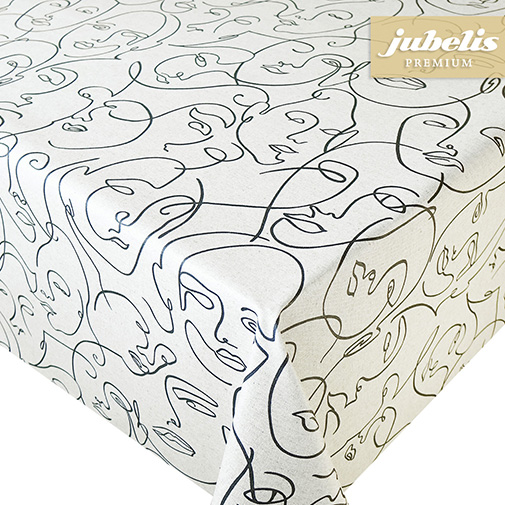 Die Tischdecke mit dem Namen Epifania besitzt einen naturfarbenen Untergrund mit einem sich wiederholenden Muster aus stilisierten, abstrakt dargestellten Gesichtern. Die Gesichter sind nur durch schwarze Linien skizziert. Die Gesamtkomposition des Musters wirkt dynamisch und modern. Mit diesem modernen Muster bringen sie Schwung in den Wohnbereich. Aber auch im geschützten Außenbereich kann diese beschichtete Tischdecke gut eingesetzt werden. Einfaches Abwischen der Oberfläche der Tischwäsche reicht aus, um leichte Verschmutzungen zu entfernen. In der Größenauswahl finden Sie die Tischdeckengrößen und die passenden Formen zum Bestellen. Benötigen Sie von dieser schönen und robusten Tischdecke aus beschichteter Baumwolle eine größere Stückzahl, so empfiehlt sich hier der rabattierte Kauf einer ganzen Rolle dieser besonderen Meterware.