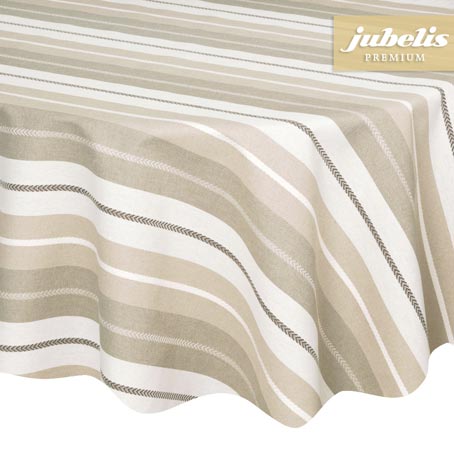 Die beschichtete Baumwolltischdecke Juliana Beige überzeugt mit ihrem zeitlosen Stil. Sie ist in den Farben weiß, beige und braun gehalten und passt somit zu beinahe jedem Einrichtungsstil. Die Streifen dieser Tischdecke sind unterschiedlich breit und sorgen dadurch für einen optisch längeren beziehungsweise breiteren Tisch. Die schmalen Streifen weisen ein Pfeilmuster auf, welches zusätzlich eine gewisse Dynamik in diesen Tischschmuck bringt. Die Tischdecke Juliana Beige besteht aus einem abwaschbaren Baumwollstoff und ist somit hervorragend für den Essenstisch geeignet. Ob zur nächsten Familienfeier, zum Kindergeburtstag, zu den alltäglichen Mahlzeiten oder auch für den Gartentisch, Juliane Beige ist nahezu überall einsetzbar und gern gesehen.