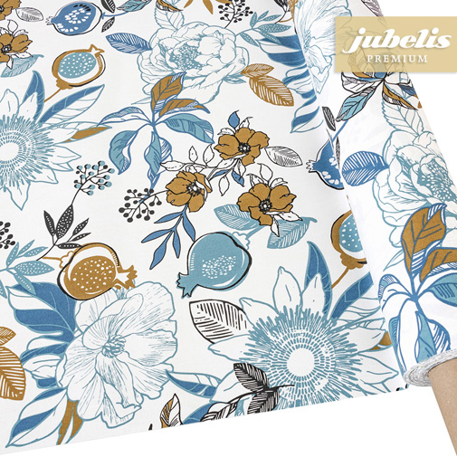 Der Tischbelag Liyana Blau ist aus Baumwollstoff hergestellt, der mit neuesten Technologien hochwertig beschichtet wurde. Die feine Struktur und Griffigkeit des Stoffes bleibt dabei erhalten. Eine erstklassige Qualität garantiert die Langlebigkeit der wasserabweisenden und pflegeleichten Eigenschaften einer nachhaltigen Tischbedeckung. Das florale Muster erscheint wie gemalt und zeigt eine Kombination aus üppigen Blüten, die an Sonnenblumen, Mohn, Bauernrosen und Hibiskus erinnern. Dazwischen mischen sich Fruchtdolden, gefüllt mit Samen und unterschiedliche Blätter. In Szene gesetzt wird die Pracht durch Blautöne, mit einer leichten Tendenz zu Grün und einem hellem Braun, auf weißem Hintergrund. Durch nur zwei Farbtöne wirkt der Tischbelag fast dezent und bringt unendliche Blumenfreude auf Küchen- und Esszimmer-Tisch zuhause sowie in die Gasträume von romantischen Lokalitäten.