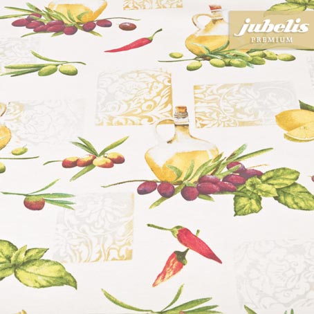 Egal ob in einer Pizzeria oder Trattoria oder auch nur einfach privat zu Hause, als Schmuck für den Küchentisch, die beschichtete Baumwolltischdecke Oliana bereitet durch ihre Motive den Gaumen auf mediterrane kulinarische Highlights vor. Sofort werden Erinnerungen an den letzten Urlaub geweckt, der vielleicht am Mittelmeer verbracht wurde. Das aromatische Olivenöl, dass mit einem besonderem Weißbrot verköstigt wurde - ein idealeres Motiv um bei Gästen Gemütlichkeit und Entspannung hervorzurufen, gibt es kaum. Dieses mediterrane Motiv ist ideal für Terrassentische aber auch für den Esstisch in einem Restaurant. Dabei zeichnet sich die Baumwolltischdecke durch ihre Beschichtung aus, die sich besonders weich und hochwertig in ihrer Textur anfühlt, dennoch aber wasserabweisend ist. Dies macht die Pflege und Reinhaltung der Tischdecke einfach.