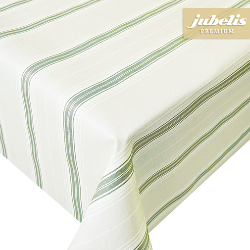 Diese Tischdecke besitzt ein einfaches Muster, bei dem Streifen in den Farben beige, weiß und grün gefärbt sind. Die so gestaltete abwaschbare Tischdecke macht optisch einen dezenten Eindruck und sie ist in vielen Bereichen gut einsetzbar. Dabei bedeckt das Streifenmuster gleichmäßig die gesamte Fläche des Tischbelags. Die Tischwäsche mit dem Namen Ravena ist hier im Onlineshop auch noch in anderen attraktiven Farbkombinationen auswählbar. Dank seiner Oberflächenbeschichtung ist diese Tischwäsche aber auch gut im Außenbereich einsetzbar. Daher wird diese auch gerne in gastronomischen Bereichen eingesetzt. Haben Sie ermittelt, welche Deckengröße sie benötigen, so finden Sie direkt neben der Produktabbildung eine große Auswahl von verschiedenen Größen und Formen. Benötigen Sie von dieser schönen Meterware eine größere Menge, so empfiehlt sich hier der Kauf einer ganzen Rolle.