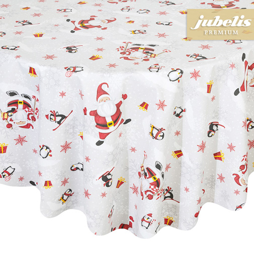 Dieser Tischbelag bringt fröhliche Weihnachtsstimmung auf den Esstisch. Frohgestimmte Weihnachtsmänner sind auf dem Tischbelag zu sehen, dies sich gemeinsam mit niedlichen Pinguinen und festlich verpackten Paketen auf dem Tischtuch tummeln. Ski und Schneeschuhe lassen vor dem weißen Hintergrund mit zarten Schneeflocken Motiven darauf schließen, dass Weihnachtsvorbereitungen am Nordpol unterwegs sind. In der Weihnachtszeit passt dieses Tischtuch einfach auf jeden Tisch und sorgt auch bei den Kindern dabei sorgt, das weihnachtliche Vorfreude aufkommt. Die Tischdecke ist eindeutig der eindeutige Höhepunkt auf dem Tisch und man setzt daher am besten ein einfaches, weißes Geschirr ein, um nicht von dem Tischtuch abzulenken. Es ist praktisch, dass die Oberfläche des Tischtuchs einfach abgewischt werden kann. So eignet sich dieser Tischbelag wunderbar für die fröhliche, vorweihnachtliche Familienmahlzeit.