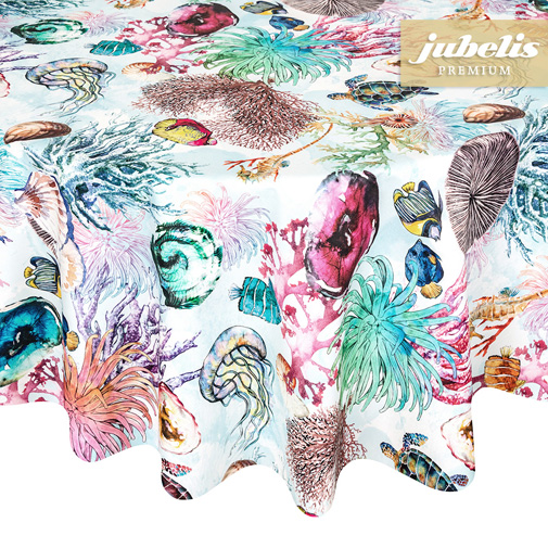 Der textile Textiler Luxus-Tischbelag Creature marine besticht durch sein tolles Design und gibt Ihrem Wohn- oder Essbereich Farbe. So viel sei vorweg bereits verraten: Der Tischbelag lässt sie in eine märchenhafte Unterwasserwelt eintauchen. Korallen, Quallen, Fische, Schildkröten in bunten Farben lassen Sie beinahe daran denken, als wäre der Ozean bei Ihnen zuhause. Detailgetreu und lebensecht sind sämtliche Meeresbewohner dargestellt. Insgesamt wird durch diesen Tischbelag ein Gefühl von ozeanischer Ferne vermittelt. Das Material des Tischbelages ist aus Luxus-Baumwollstoff mit leichter Beschichtung und somit qualitativ hochwertig gehalten.