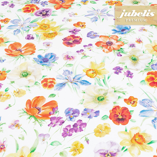 Wer freut sich nicht, wenn endlich die ersten Blumen kommen? Mit dieser Tischdecke müssen Sie gar nicht mehr warten. Denn Marcella setzt auf ein Blumendekor, das Mohn, Lilien und Iris in voller Größe wunderschön zur Geltung bringt. Wie auf einer echten Blumenwiese freut sich das Auge an den satten Farben, an Gelb, Rot, Lila und Blau, die in geschmackvoller Abstufung ein schönes Gesamtbild schaffen. Marcella ist ein Tischtuch für jeden Tag. Immer einladend, immer freundlich, höchst unkompliziert. Flecken fallen nicht auf und können leicht abgewischt werden. Ob Frühstück, Mittag- oder Abendessen: Mit weißer oder bunter Keramik decken Sie diese Luxusware gekonnt ein. Ebenso wirkt Marcella mit Ostereiern und Häschen an Ostern besonders dekorativ.