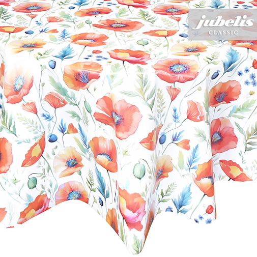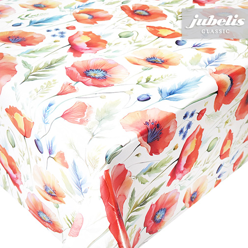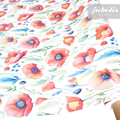 Diese farbenfrohe Tischdecke aus Wachstuch besitzt ein Muster, welches die Blicke auf sich zieht. Das freundliche Wachstuch besitzt verschiedene Abbildungen von Klatschmohn, die auf hellem Grund nahe beieinander liegen. Dieses schöne Wachstuch mit dem Namen Fine sorgt in Ihrem Wohnbereich garantiert für gute Stimmung. Der abwaschbare Tischbelag besitzt eine glatte und wasserabweisende Oberfläche. Einfaches Abwischen genügt, um Verschmutzungen von der Tischdecken-Oberfläche zu entfernen. Auf der Rückseite dieses Tischbelags befindet sich eine Vliesschicht, die empfindliche Tischoberflächen schützt. Somit ist dieses schöne Wachstuch sowohl für private als auch gewerbliche Anwendungen im Innen- und Außenbereich eine praktische und robuste Tischwäsche. Das Wachstuch ist hier als passgenaue Tischdecke, Meterware oder ganze Rolle mit einem zusätzlichen Rabatt erhältlich. Neben der Produktabbildung können Sie die gewünschte Größe und Form einfach auswählen. Profitieren Sie von dieser praktischen und schönen Tischwäsche aus Wachstuch mit ihrem guten Preis-Leistungsverhältnis.