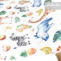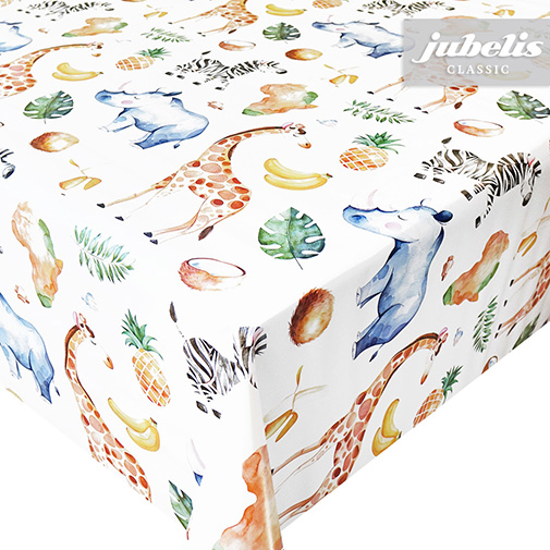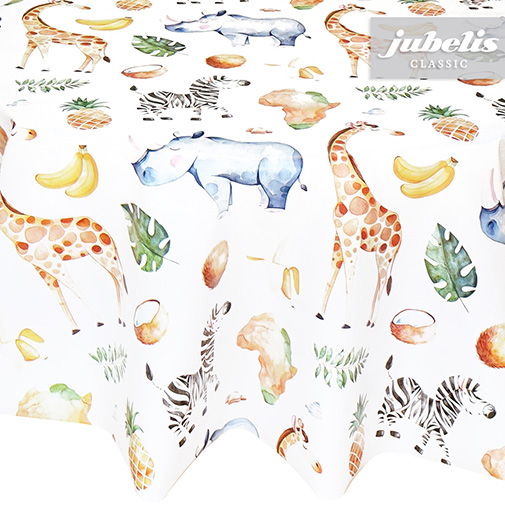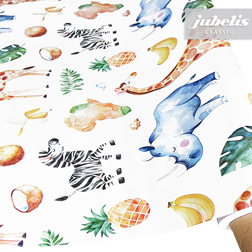 Diese abwaschbare Tischdecke aus Wachstuch besitzt schön gezeichnete afrikanische Tierabbildungen und Früchte, die kindgerecht dargestellt sind. Auf dieser schönen Tischdecke gibt es nicht nur für Kinderaugen viel zu entdecken, sondern sie schützt auch wirksam empfindliche Tischoberflächen. Der abwaschbare Tischbelag besitzt eine glatte und wasserabweisende Oberfläche. Einfaches Abwischen genügt, um Verschmutzungen von der Tischdecken-Oberfläche zu entfernen. Auf der Rückseite dieses Tischbelags befindet sich eine Vliesschicht, die empfindliche Tischoberflächen schützt. Somit ist dieses schöne Wachstuch sowohl für private als auch gewerbliche Anwendungen im Innen- und Außenbereich eine praktische und robuste Tischwäsche. Das Wachstuch ist hier als passgenaue Tischdecke, Meterware oder ganze Rolle mit einem zusätzlichen Rabatt erhältlich. Neben der Produktabbildung können Sie die gewünschte Größe und Form einfach auswählen. Profitieren Sie von dieser praktischen und schönen Tischwäsche aus Wachstuch mit ihrem guten Preis-Leistungsverhältnis.