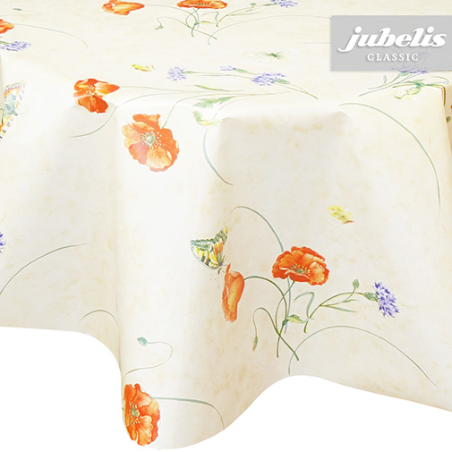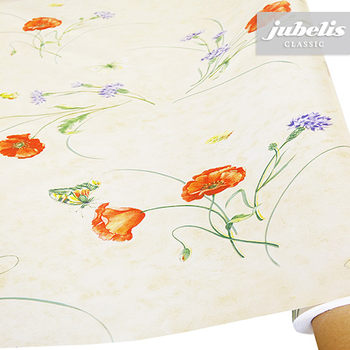 Schöne Abbildung von Klatschmohn und Kornblumen sind hier kombiniert mit verschiedenen Schmetterlingen zu einer schönen optischen Gesamtkomposition vereint. Diese Tischdecke aus Wachstuch kann in vielen Wohnbereichen als praktischer Helfer im Alltag und zur optischen Aufwertung eingesetzt werden. Der abwaschbare Tischbelag besitzt eine glatte und wasserabweisende Oberfläche. Einfaches Abwischen genügt, um Verschmutzungen von der Tischdecken-Oberfläche zu entfernen. Auf der Rückseite dieses Tischbelags befindet sich eine Fliesschicht, die empfindliche Tischoberflächen schützt. Somit ist dieses schöne Wachstuch sowohl für private als auch gewerbliche Anwendungen im Innen- und Außenbereich eine praktische und robuste Tischwäsche. Das Wachstuch ist hier als passgenaue Tischdecke, Meterware oder ganze Rolle mit einem zusätzlichen Rabatt erhältlich. Neben der Produktabbildung können Sie die gewünschte Größe und Form einfach auswählen. Profitieren Sie von dieser praktischen und schönen Tischwäsche aus Wachstuch mit ihrem guten Preis-Leistungsverhältnis.