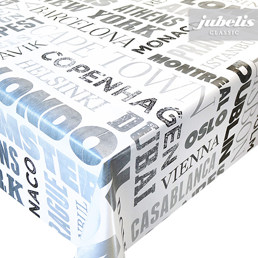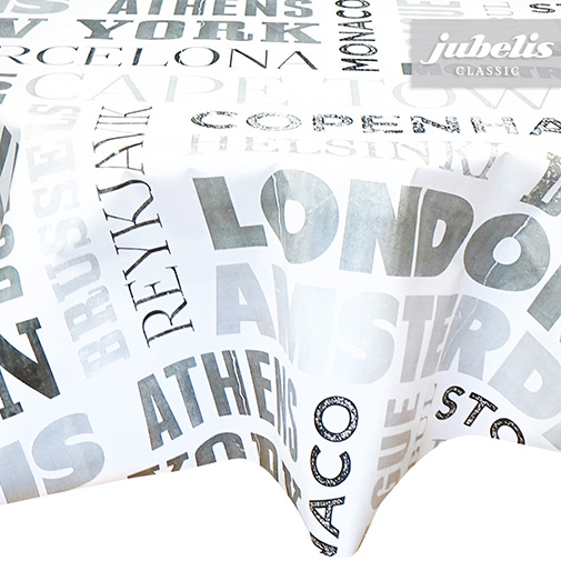 Dieses Wachstuch trägt als Muster verschiedene Städtenamen aus aller Welt. Somit macht diese abwaschbare Tischedecke einen eher internationalen Eindruck und bringt die eine oder andere Reise beim Betrachten wieder in Erinnerung. Der abwaschbare Tischbelag besitzt eine glatte und wasserabweisende Oberfläche. Einfaches Abwischen genügt, um Verschmutzungen von der Tischdecken-Oberfläche zu entfernen. Auf der Rückseite dieses Tischbelags befindet sich eine Fliesschicht, die empfindliche Tischoberflächen schützt. Somit ist dieses schöne Wachstuch sowohl für private als auch gewerbliche Anwendungen im Innen- und Außenbereich eine praktische und robuste Tischwäsche. Das Wachstuch ist hier als passgenaue Tischdecke, Meterware oder ganze Rolle mit einem zusätzlichen Rabatt erhältlich. Neben der Produktabbildung können Sie die gewünschte Größe und Form einfach auswählen. Profitieren Sie von dieser praktischen und schönen Tischwäsche aus Wachstuch mit ihrem guten Preis-Leistungsverhältnis.