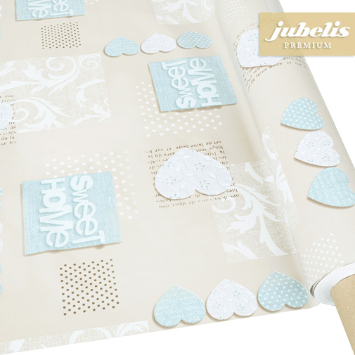 Dieses hochwertige Tischtuch aus Wachs kommt in einem romantisch, verspieltem Design daher und fügt sich so ideal in Ihre Deko ein. Das Modell aus dem Hause Jubelis hat als Grundfarbe ein zartes beige und besticht durch ein individuelles Muster in verschiedenen Blautönen. Herzen in blau weiß und der Spruch "Home Sweet Home" zieren die Tischdecke. So ist das gute Stück nicht nur ideal für die Innendekoration, sondern passt auch hervorragend in den Außenbereich. Beispielsweise auf einer Gartenparty oder einer Hochzeit im Sommer, sind die Tische mit diesem Modell immer besonders eingedeckt. Sie bekommen die Decke in den verschiedenen Standardmaßen, haben aber auch die Möglichkeit, die Decke als Meterware zu kaufen. Die Oberfläche ist hochwertig beschichtet und kann somit auch Feuchtigkeit wie ein umgekipptes Glas oder einen leichten Regen vertragen.