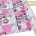 Dieses hochwertige Wachstuch ist mit einem unglaublich vielfältigen Muster ausgestattet. Quadratische Formen reihen sich harmonisch aneinander. Hellrosa Kirschblüten in voller Pracht bieten florale Fantasien an. Naturmaterialien wie hellgraue Steine und braune Rindenteile ergänzen das Muster auf interessante Art und Weise. Weiße Schriftzüge und rosa Quadrate mit weißen Punkten liefern überraschende Effekte. Wenn das kein Wow-Erlebnis ist! Wer nach Lebensfreude sucht, wird hier schnell fündig. Ein Blick auf dieses bunte, abwechslungsreiche Tischtuch verzaubert jeden Betrachter. Ein Herz, das auf hellgrauem Sand gezeichnet ist, vermittelt Romantik und Verspieltheit. Dazu eignen sich hervorragend pinke Servietten. Wer es gerne etwas dezenter mag, greift zu weißer Tischdekoration, zum Beispiel Kerzenhalter.