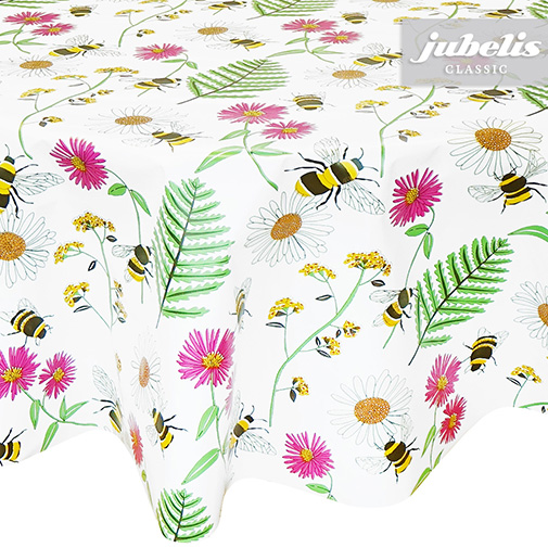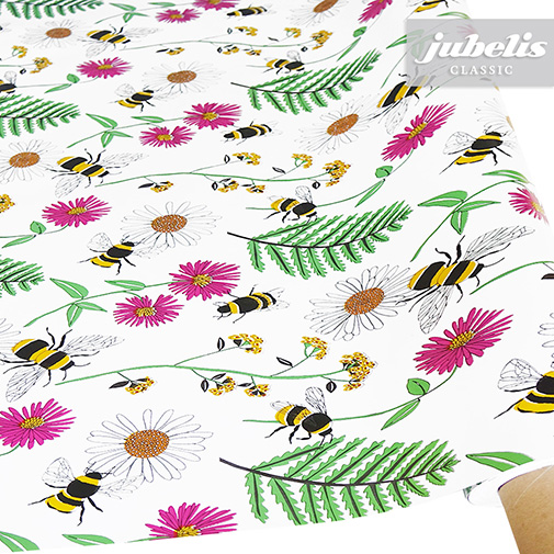 Bienen und verschiedene Blumen und Blätter sind Hauptbestandteil dieses schönen Musters. Für dieses freundliche Wachstuch gibt es viele verschiedene Anwendungsbereiche. Der abwaschbare Tischbelag besitzt eine glatte und wasserabweisende Oberfläche. Einfaches Abwischen genügt, um Verschmutzungen von der Tischdecken-Oberfläche zu entfernen. Auf der Rückseite dieses Tischbelags befindet sich eine Vliesschicht, die empfindliche Tischoberflächen schützt. Somit ist dieses schöne Wachstuch sowohl für private als auch gewerbliche Anwendungen im Innen- und Außenbereich eine praktische und robuste Tischwäsche. Das Wachstuch ist hier als passgenaue Tischdecke, Meterware oder ganze Rolle mit einem zusätzlichen Rabatt erhältlich. Neben der Produktabbildung können Sie die gewünschte Größe und Form einfach auswählen. Profitieren Sie von dieser praktischen und schönen Tischwäsche aus Wachstuch mit ihrem guten Preis-Leistungsverhältnis.