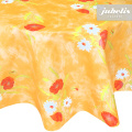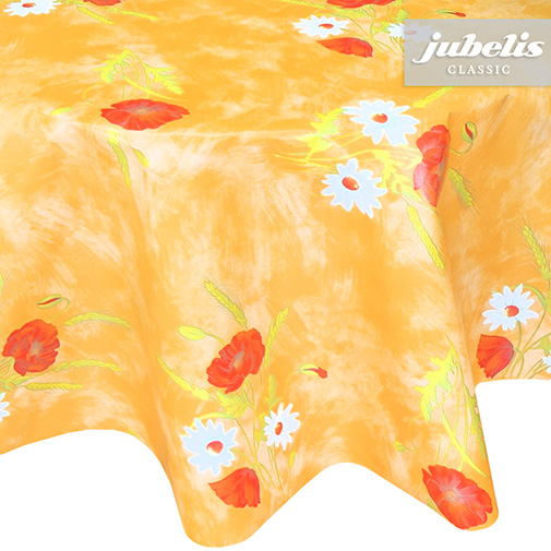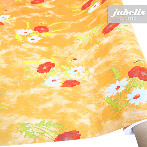 Diese schöne Tischdecke besitzt einen leicht orange marmorierten Untergrund, auf dem verschiedene Kompositionen von Blumen angeordnet sind. Dieses Wachstuch macht einen freundlichen und farbenfrohen Eindruck und kann so gut zur Wohnraumgestaltung eingesetzt werden. Der abwaschbare Tischbelag besitzt eine glatte und wasserabweisende Oberfläche. Einfaches Abwischen genügt, um Verschmutzungen von der Tischdecken-Oberfläche zu entfernen. Auf der Rückseite dieses Tischbelags befindet sich eine Fliesschicht, die empfindliche Tischoberflächen schützt. Somit ist dieses schöne Wachstuch sowohl für private als auch gewerbliche Anwendungen im Innen- und Außenbereich eine praktische und robuste Tischwäsche. Das Wachstuch ist hier als passgenaue Tischdecke, Meterware oder ganze Rolle mit einem zusätzlichen Rabatt erhältlich. Neben der Produktabbildung können Sie die gewünschte Größe und Form einfach auswählen. Profitieren Sie von dieser praktischen und schönen Tischwäsche aus Wachstuch mit ihrem guten Preis-Leistungsverhältnis.