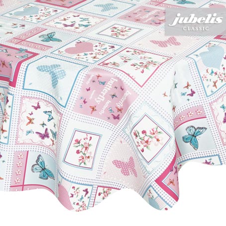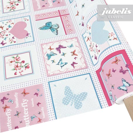 Die Wachstuch Tischdecke Meghan in hellblau-rosa überzeugt mit ihrer verspielten Optik. Im Zentrum des Designs stehen die bunten Schmetterlinge sowie die Herzmotive, die das ganze Jahr über für ein sommerliches Gefühl sorgen. Die einzelnen Motive werden durch den Einsatz von quadratischen Elementen geordnet, wodurch eine aufgeräumte Patchwork-Optik entsteht. Das bunte Design der Tischdecke kreiert in jedem Raum eine angenehme Retro-Atmosphäre und kommt vor allem in der Küche oder im Außenbereich sehr gut zur Geltung. Dank der abwaschbaren Oberfläche lässt sich die Tischdecke zudem problemlos reinigen. Das griffige Material auf der Rückseite verhindert darüber hinaus ein Rutschen der Wachsdecke. Hergestellt wurde das Produkt in der Türkei.