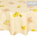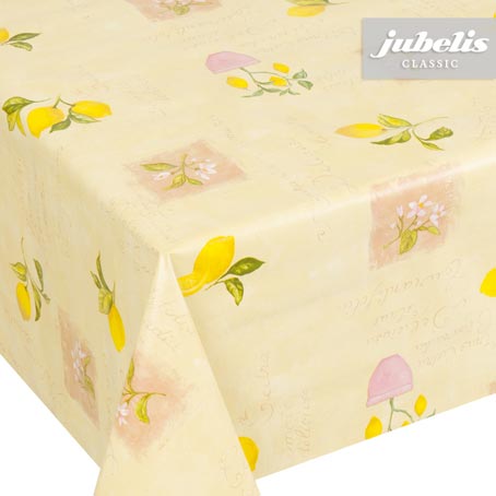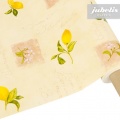 Diese Tischdecke aus Wachstuch ist in freundlichen Beige- und Gelbtönen gehalten. Der Hintergrund ist in einer Mischung aus Zartgelb und Beige gestaltet, so dass die kräftig gelben Zitronen mit den grünen Blättern wie hingetupft wirken. Die weißen Blüten mit kleinen grünen Blättern befinden sich jeweils auf etwas dunkleren Vierecken in Altrosa. Dezente, geschwungene Schriftzüge zwischen den Bildern von Zitronen und Blüten lockern die Optik auf und sorgen für ein mediterranes Flair. Die einzelnen Motive haben eine Größe von etwa 10 cm im Quadrat und sind im unregelmäßigen Abstand auf dem Hintergrund angeordnet. Auch die Motive selbst unterscheiden sich ein wenig, was ebenfalls für ein lockeres, optisch ansprechendes Gesamtbild sorgt. Dieser wetterfeste Wachstuchbelag ist ideal für den Balkon- oder Terrassentisch geeignet, wird aber auch gerne im Innenbereich eingesetzt. Die große Auswahl der verschiedenen Designs an schönen Wachstüchern finden Sie in unserem Onlineshop. Die Decken werden entsprechend der gewünschten Größe gratis zugeschnitten. Sie können außerdem ganze Rollen 20 Meter lang bestellen. Eine oder mehrere Wachstuchdecken werden gerne für Freiluft-Veranstaltungen wie Grillfeste und Geburtstage verwendet, da sie problemlos abgewischt werden können und hinterher nicht in die Waschmaschine müssen. Sowohl draußen als auch drinnen kommt diese Tischdecke im mediterranen Zitronen-Design gut an. Sie versprüht mediterranes Flair und lässt sich prima mit gelben Servietten und Kerzen bzw. Windlichtern kombinieren, aber auch mit weißen Deko-Elementen wie Blumen oder Blütenzweigen. Originell sind auch Schalen mit Zitronen, die als Dekoration in die Mitte gestellt werden können. Wer sagt denn, dass es immer Blumen sein müssen? Die Wachstuch-Tischdecke eignet sich ebenso hervorragend für den Kaffeetisch und wirkt auch bei einem festlichen Essen attraktiv. Das strapazierfähige Material mit Oberflächenversiegelung ist wetterfest und pflegeleicht, kann also auch über einen längeren Zeitraum auf dem Terrassentisch liegen bleiben. Um es zu reinigen, reicht ein feuchtes Tuch aus. Die Vliesrückseite schützt Oberflächen aller Art vor Feuchtigkeit und Verschmutzungen und sorgt zudem für eine Dämpfung. Das Wachstuch lässt sich auf die gewünschte Größe und Form zuschneiden, ohne dass die Schnittkanten umsäumt werden müssen. Dadurch bieten sich vielfältige Einsatzmöglichkeiten an, denn das Material lässt sich optimal verkleben und ist somit auch gut für Bastelarbeiten zu verwenden.