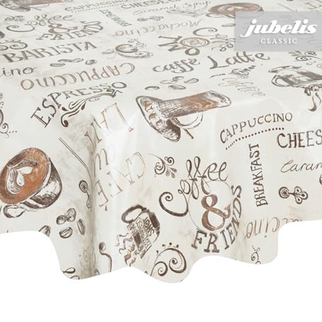 Möchten auch Sie eine Tischdecke für ihren Küchen- oder Esszimmertisch erwerben oder wollen Sie gleich ein ganzes Café damit ausstatten? Dann ist unser Wachstuch "Ristretto" im Farbton Latte genau das Richtige. Die Wachstuchtischdecken mit ihrem Design im Kaffeehaus-Stil sind in unterschiedlichen Größen erhältlich und man kann bei Bedarf auch ganze Rollen erwerben. Der Tischbelag ist in einem hellen Creme-Ton gehalten und besitzt vielseitige Aufdrucke von Kaffeebechern, Latte-Macchiato Gläsern und Kaffeebohnen. Alle Abbildungen sind in Brauntönen gehalten. Zudem findet man auf der Tischdecke Schriftzüge von unterschiedlichen Kaffeesorten oder Arten von Kuchen. Somit lässt sich die Tischdecke "Ristretto" ideal in der Küche oder im Esszimmer platzieren oder kann auch im Café als pflegeleichte Tischunterlage verwendet werden. Der Kaffeehaus-Stil bringt eine gewisse Gemütlichkeit mit sich und lässt sich vor allem neutralen Tönen sehr gut anpassen. Möchten auch Sie eine abwaschbare Tischdecke im Kaffeehaus-Stil, dann ist das Wachstuch "Ristretto Latte" genau das Richtige für Sie.