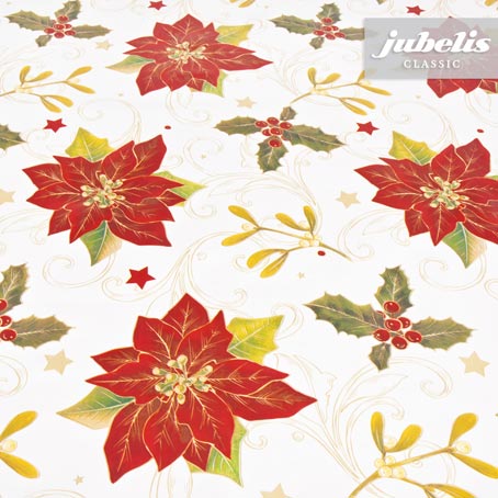 Alle Jahre wieder. Weihnachten ist das Fest der Liebe. Werte wie Familie, Herzenswärme und Besinnlichkeit werden zu dieser Zeit ganz besonders groß geschrieben. Dazu gehört natürlich auch die passend dekorierte Tafel für das Festessen im Kreis der Familie. Schmücken Sie Ihren Esstisch doch einmal mit dieser abwaschbaren Tischdecke. Der Name sagt es schon: Hier spielt der Weihnachtsstern die Hauptrolle. Das leuchtende Rot der Blüten, gepaart mit dem satten Grün der Blätter lässt sofort weihnachtliche Stimmung aufkommen. Der Hintergrund in sanftem Weiß rundet das Bild perfekt ab. Hier und da findet sich auch vereinzelt ein roter Stern und macht den Gesamteindruck perfekt. Nicht nur beim besinnlichen Zusammensein mit der Familie sind sie mit dieser abwaschbaren Wachstischdecke gut beraten. Auch auf Punschständen und Weihnachtsmärkten macht das strapazierfähige Wachstuch immer eine gute Figur. Machen sie sich keine Gedanken mehr über schwer entfernbare Flecken. Die glatte Oberfläche ist leicht zu reinigen und wird sie viele Jahre lang begleiten. Oder verwenden sie das Wachstuch doch einmal als Christbaumunterlage. Sie werden von der stimmigen Wirkung überrascht sein.