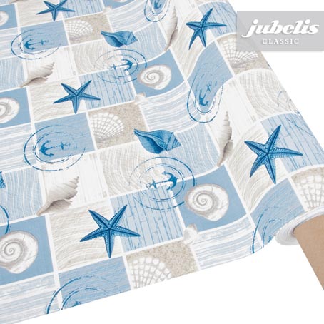 Das Wachstuch Marina blau ist das passende Modell für alle, die in ihrer Einrichtung eher kühle, moderne Farben bevorzugen und mit maritimer Note Akzente setzen wollen. Die dominierenden Farben des Tischbelags sind leichte Blau- und Sand-Töne, die harmonisch ineinander greifen. Als Motive fungieren verschiedene maritime Elemente wie Muscheln, Schnecken, Seesterne und Anker, die sich regelmäßig über das Tuch ziehen und kleine Akzente setzen. Die Blau- und Beigetöne wechseln sich gleichmäßig ab und sind in kleinen Quadraten angeordnet, die ein dezentes Karo-Muster ergeben. Durch die dezente Farb- und Motivwahl kann das Tischtuch Marina blau problemlos das ganze Jahr über auf dem Tisch liegen. Es ist weder an eine bestimmte Jahreszeit noch an Ereignisse gebunden, sondern passt einfach immer, wenn man Lust auf dieses Design hat. Dabei hat man zudem den Vorteil, dass das Wachstuch sehr robust ist. So kann es sowohl innerhalb von Räumen, als auch im Außenbereich verwendet werden und ist dabei allen Anforderungen sowie Witterungsverhältnissen gewachsen.